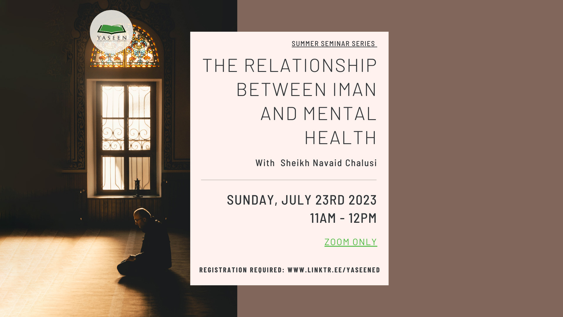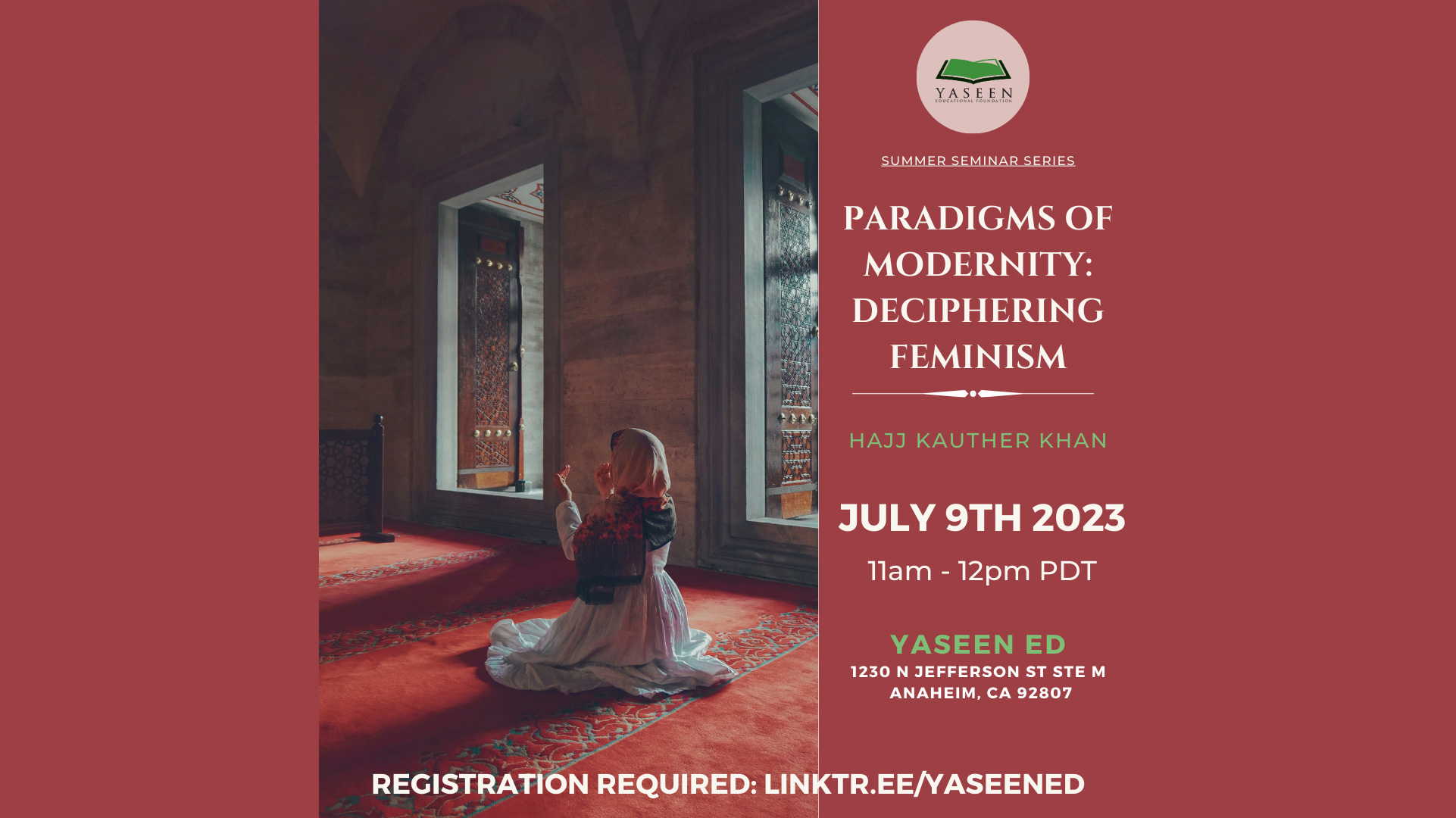 Yaseen OC 1139 N Anaheim Blvd, Anaheim, CA, United StatesLed by Hajj Kauthar Khan, this thought-provoking session will delve into the intricate intersections between feminism and modernity. Taking place on Sunday, July 9th, 2023, from 11:00 am to 12:00 pm PDT, the seminar will be held exclusively in-person at the Yaseen OC. Don't miss this enlightening opportunity to gain a deeper understanding of feminism within the context of modernity.